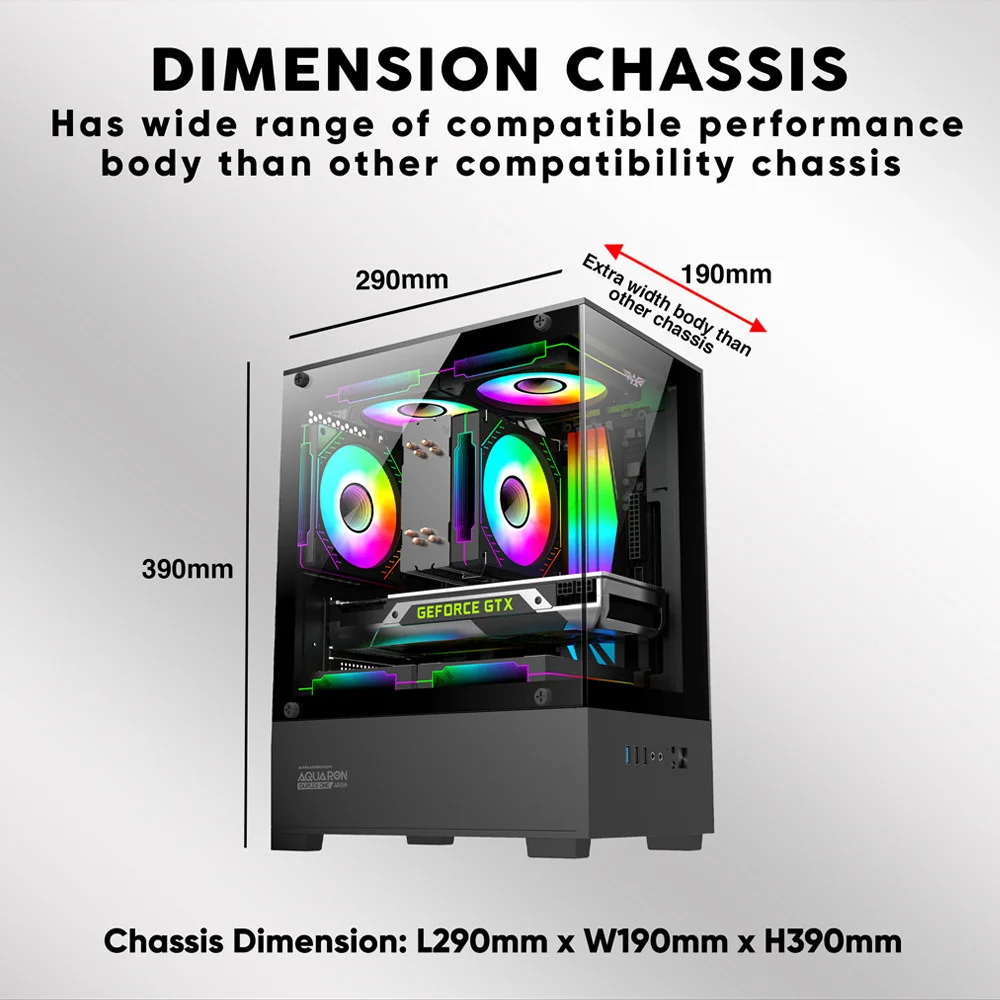 | Descripción | Descubre el Armaggeddon Aquaron Duplex One, un mini tower que fusiona a la perfección estilo y funcionalidad. Fabricado con acero y vidrio templado, es compatible con placas base desde Mini ITX hasta MATX. Cuenta con 4 ranuras de expansión, bahías para unidades de 3.5″ y 2.5″, y un panel de E/S que incluye puertos USB 3.0 y 2.0. Su diseño inteligente permite la instalación de hasta 5 ventiladores, además de ser compatible con refrigeración por aire y por agua, asegurando un rendimiento óptimo y manteniendo el hardware a temperaturas ideales. Su formato compacto lo convierte en la opción ideal para gamers que buscan rendimiento sin sacrificar espacio. | Espacio generoso para tarjetas gráficas de hasta 305mm, con un diseño interno que facilita la gestión de cables y mantiene todo en orden. Con espacio para hasta 6 ventiladores y soporte para refrigeración líquida, el QG-008 mantiene tu sistema siempre fresco, incluso en las sesiones de juego más intensas. | El GameMax Contac Turbo es un gabinete de torre media con ventana lateral de vidrio y fácil apertura. Incluye dos ventiladores, uno ARGB de 14 cm al frente y otro de 12 cm atrás.